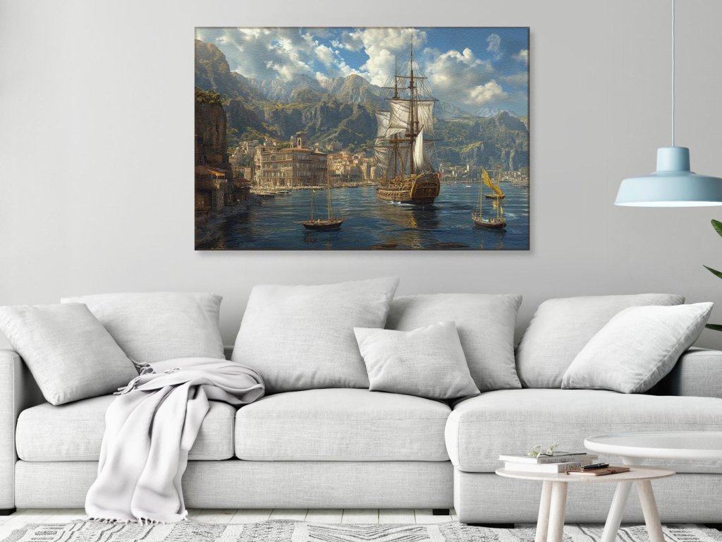 Obraz zobrazuje malebný prístav obklopený vysokými horami. Plachetnice kotvia pri kamennej promenáde a zachytávajú ducha dávnych čias. Mesto na brehu má historické budovy, ktoré sú svedkami bohatej minulosti a námornej tradície.
