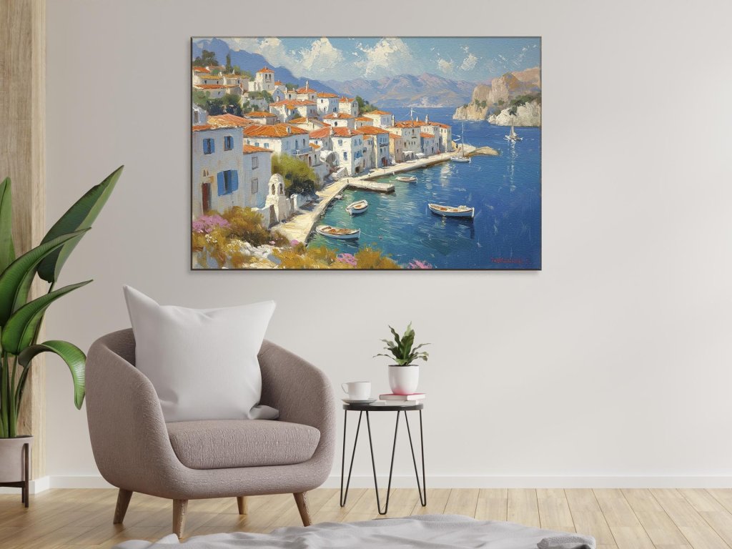 Obraz predstavuje malebný prístav s bielymi domami s oranžovými strechami. Člny sú zakotvené v azúrovom mori a na pozadí sa týčia hory pod jasným modrým nebom. Kvetinová vegetácia a jemné pobrežie dodávajú scéne pocit pokojnej stredomorskej atmosféry.