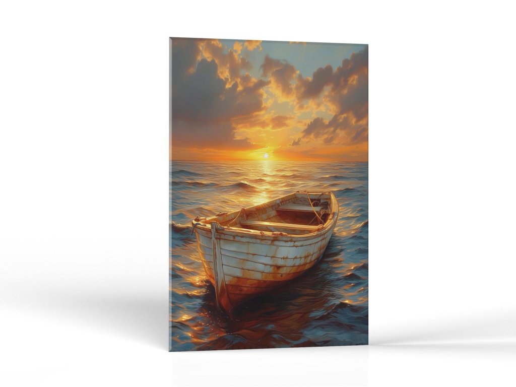 Opustená drevená loď sa kolíše na miernych vlnkách mora, zatiaľ čo slnko zapadá na horizonte a ožaruje oblohu zlatými a oranžovými farbami. Odrazy svetla na vodnej hladine vytvárajú teplý, zlatavý odtieň, a dramatické oblaky nad loďkou dodávajú scéne majestátny pocit.