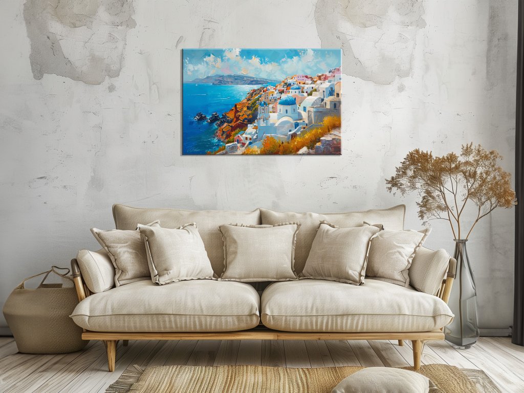 Obraz zobrazuje nádhernú panorámu Santorini, kde sa stretávajú jasné modré vody Egejského mora s bielymi budovami a typickými modrými kupolami, ktoré sú charakteristické pre túto oblasť. Jasné farby a textúry v obraze vytvárajú živý a radostný pocit, akoby ste sa práve nachádzali na tomto malebnom mieste. Kompozícia je doplnená farebnými detailmi okolitých skalných útvarov a vegetácie, čo dodáva obrazu dynamiku a hĺbku.