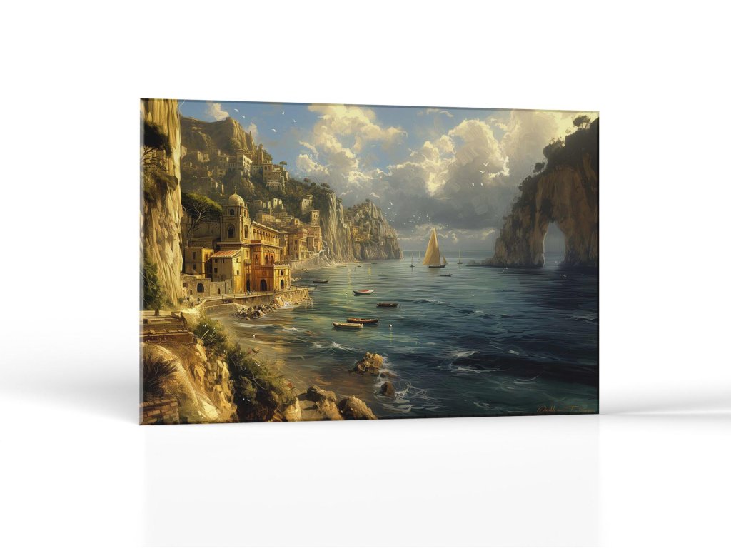 Na obrázku je zobrazené slnečné pobrežné mesto so starobylou architektúrou, ktoré sa tiahne pozdĺž skalnatého pobrežia. Modré more je spestrené plávajúcimi člnmi a plachetnicou, zatiaľ čo jemné svetlo osvetľuje scénu a vytvára teplú, pozývajúcu atmosféru. Vzdušné mraky a mierne vlny pridávajú obrazu pocit pokoja a voľnosti.