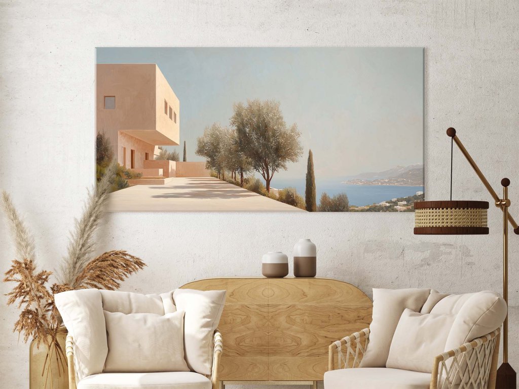 Obraz zachytáva modernú vilu v stredomorskom štýle obklopenú olivovníkmi, ktoré vytvárajú pokojný a prírodný dojem. V pozadí sa tiahne výhľad na modré more a vzdialené kopce, čo dodáva celej scéne pocit priestrannosti a slobody. Svetlé farby a minimalistický štýl architektúry vytvárajú elegantnú atmosféru, ktorá je ideálna pre oddych v letnom prostredí.