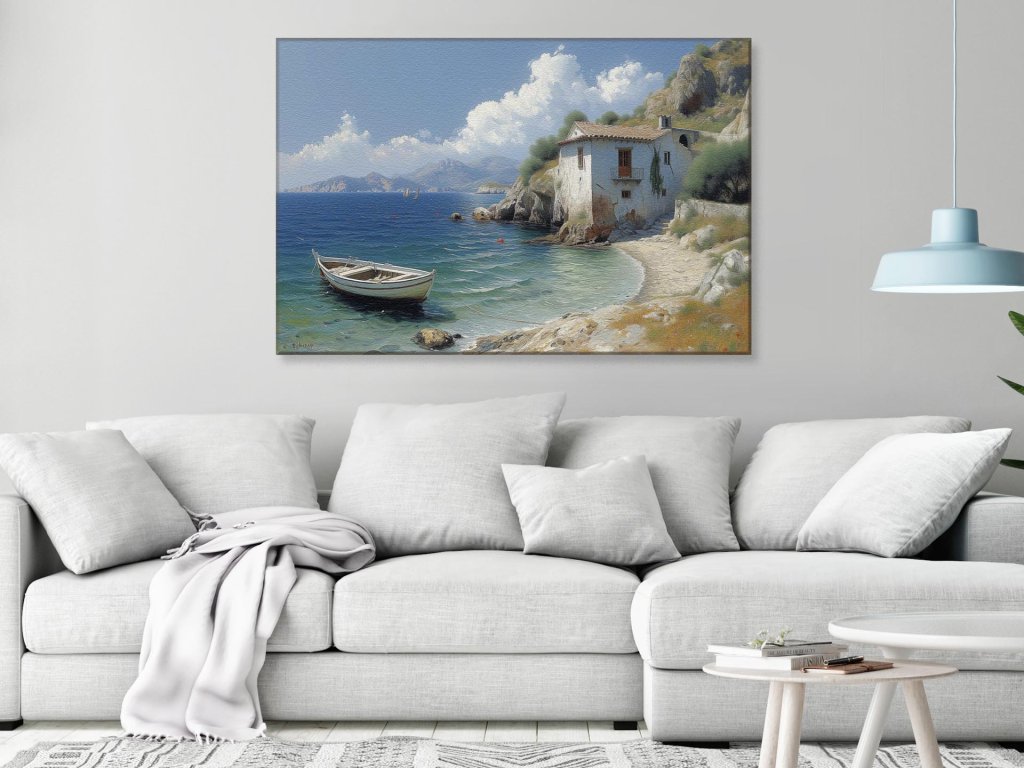 Na obraze je vidieť bielu budovu s omietkou poznačenou časom, na pokojnom pobrežnom úseku. More je kryštáľovo čisté a jeho tyrkysová farba kontrastuje s teplými odtieňmi vegetácie a skál. Obraz pôsobí pokojne a idylicky, čo umocňuje jasná obloha a majestátne hory v pozadí.