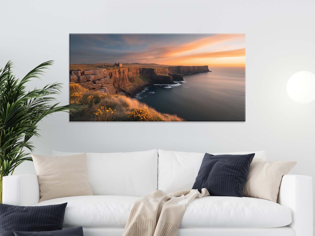 Obraz zachytáva nádhernú scenériu pobrežia, kde mohutné útesy padajú do nekonečného oceánu. Na okraji útesu stoja tajomné ruiny starobylého hradu, ktorý pôsobí ako strážca tejto divokej krajiny. Západ slnka prefarbuje oblohu do teplých oranžových a ružových odtieňov, pričom jemné svetlo osvetľuje trávnaté kopce posiate drobnými žltými kvetmi.