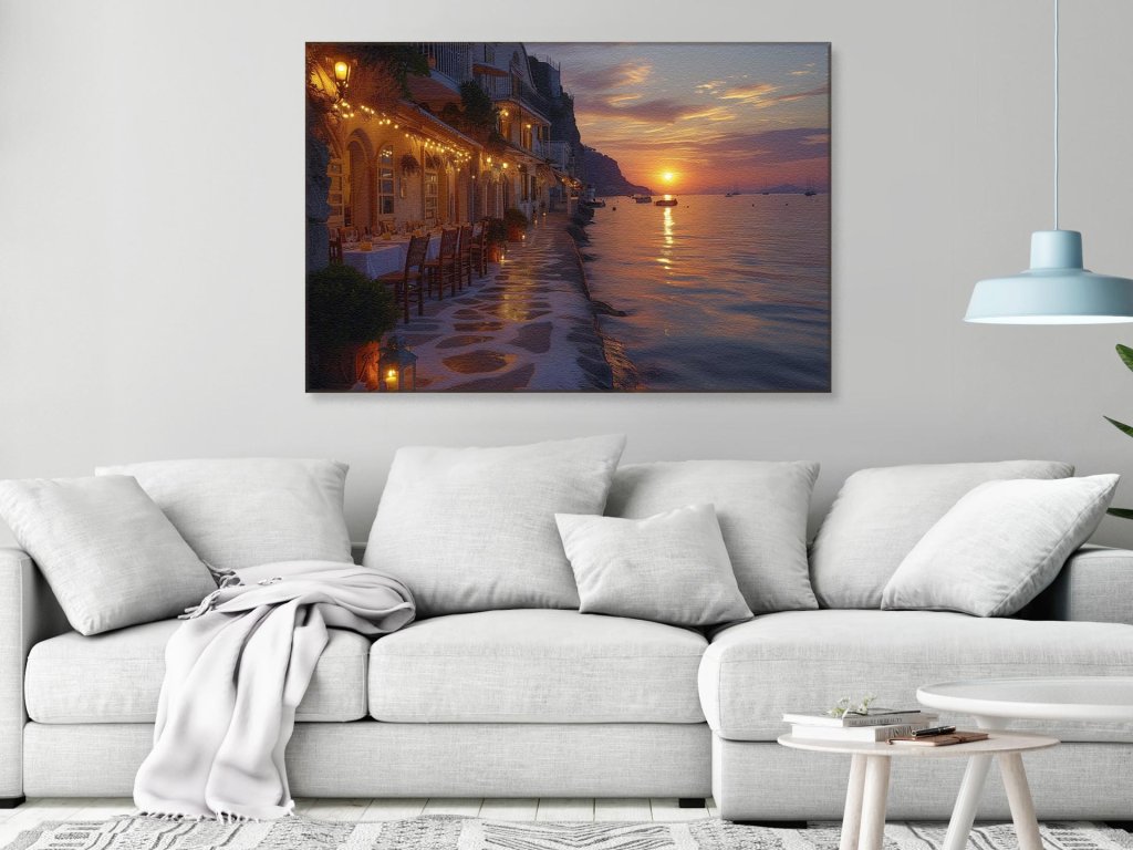 Romantický večer na promenáde, kde sa striedajú svetlá reštaurácií s mihotajúcimi sa odleskmi zapadajúceho slnka na pokojnom mori. Atmosféra pokojného večera je umocnená jemným svetlom lámp a zlatistým svetlom zapadajúceho slnka, ktoré dotvára idylický obrázok miesta na večerné posedenie.