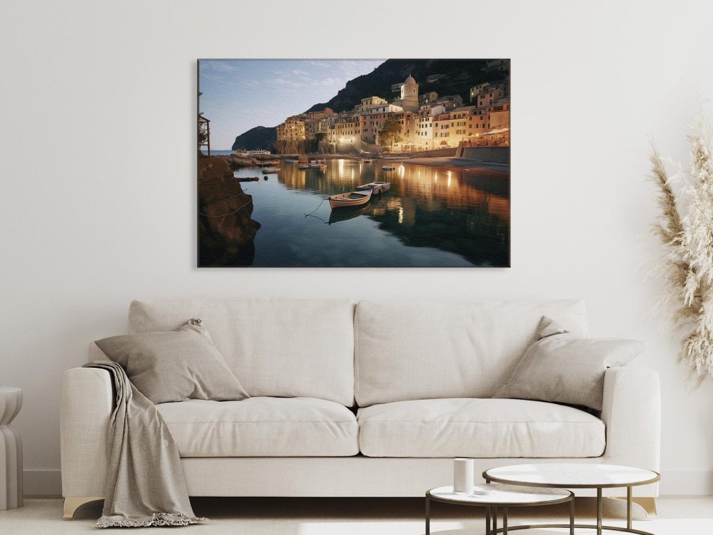 Obrázok zachytáva malebné pobrežné mestečko za západu slnka, s jeho pastelovo farebnými budovami odzrkadľujúcimi sa na pokojnej vodnej hladine. Člny sú kotvené pozdĺž pobrežia, a posledné lúče slnka jemne osvetľujú scénu. Atmosféru dokresľuje prírodná scenéria s kopcom v pozadí a mierne zatienenými fasádami budov.