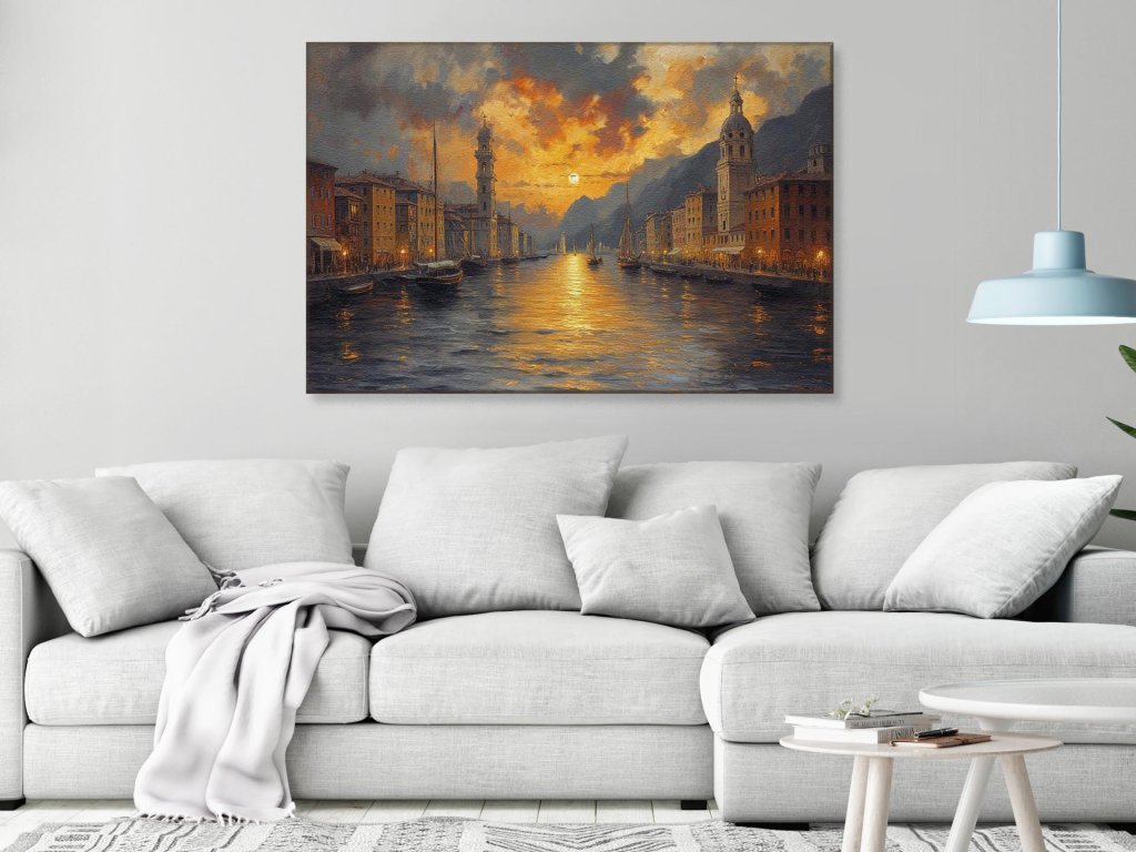 Na obraze je zachytený prístavný kanál s historickými budovami a loďami za západu slnka. Farby neba sa odrážajú na vodnej hladine, čo vytvára teplý a pokojný dojem. Scéna je osvetlená mäkkým svetlom lámp, ktoré dodávajú kompozícii romantickú atmosféru.