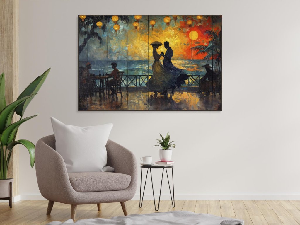 Na obraze je zobrazený pár tancujúci na drevenej promenáde pri mori za súmraku, keď sa slnko ponára do mora a obloha sa mení na paletu teplých farieb. Osvetlenie je poskytované reťazcami zavesených lampiónov, ktoré dodávajú scéne romantickú atmosféru, zatiaľ čo v pozadí môžeme vidieť siluety ďalších ľudí, ktorí si užívajú večernú pohodu. Odraz svetiel na promenáde dodáva celému obrazu pocit hĺbky a magickosti.