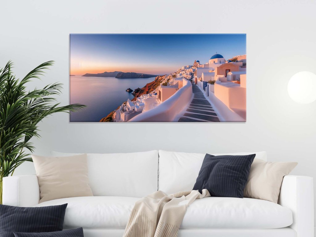 Obraz zachytáva malebné uličky Santorini, ktoré sa vinú medzi bielymi domami s modrými strechami. Západ slnka ponára krajinu do jemných ružových a oranžových odtieňov, zatiaľ čo pokojné more sa zrkadlí v jeho svetle. Tento výhľad dokonale vystihuje pokojnú a romantickú atmosféru ostrova.