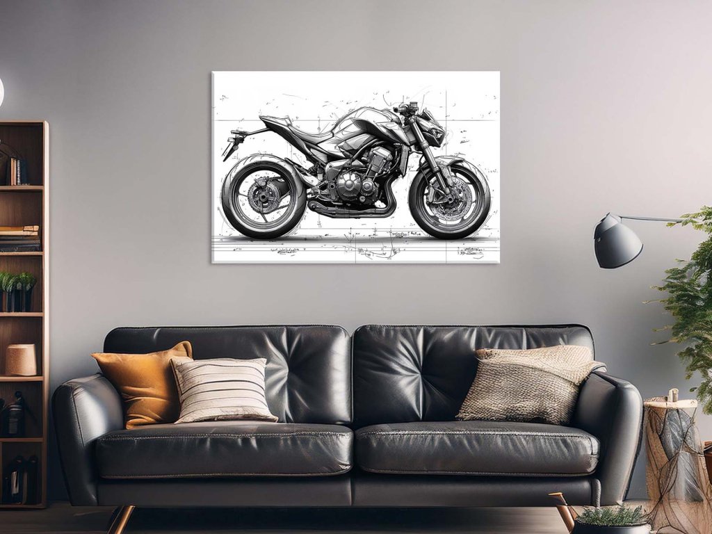 Tento obraz zobrazuje detailný technický nákres motocykla, v ktorom sú zvýraznené jednotlivé komponenty a proporcie. Nákres odhaľuje inžiniersku presnosť a sofistikovaný dizajn stroja, pričom každý prvok je starostlivo načrtnutý. Tento obraz zachytáva krásu technológie a mechaniky vo svojom najčistejšom, surovom prevedení.