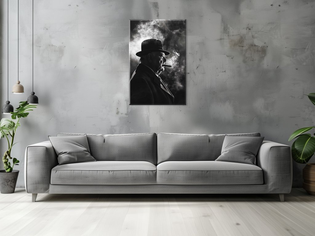 Na obraze je Winston Churchill v elegantnom klobúku, ktorý fajčí cigaru. Jeho profil je výrazne osvetlený, pričom dym z cigary jemne stúpa a vytvára okolo neho mystickú atmosféru. Kontrastné svetlo a tieň zdôrazňujú mužovu vážnosť a elegantný vzhľad.
