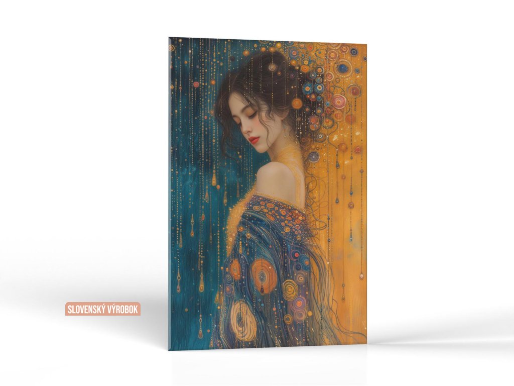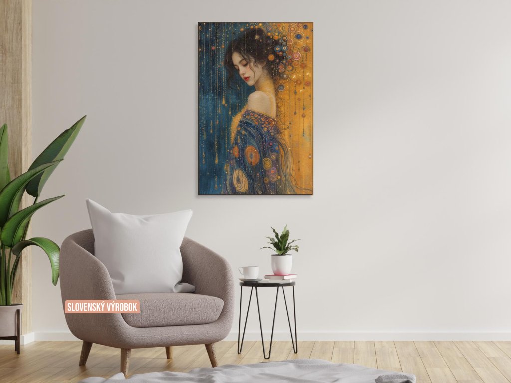 Žena s jemnými črtami tváre má zavreté oči a je zobrazená v profilovom pohľade. Jej šaty a pozadie sú zložené z bohatých abstraktných vzorov, ktoré pripomínajú mozaiku alebo vitráž, s dominanciou modrých, oranžových a zlatých odtieňov. Vzory na šatách a v pozadí obrazu vytvárajú kontrast medzi figúrou a jej okolím, a zdôrazňujú krásu a eleganciu zobrazenej postavy.