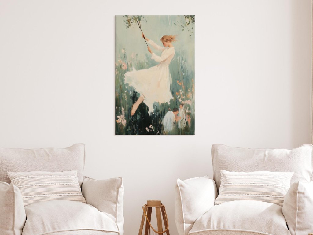 Obraz zachytáva poetický moment detskej radosti a slobody, keď sa dievča v bielej ľahkej róbe vznáša na hojdačke medzi rozkvitnutými kvetmi. Jej vlasy i šaty sa pohybujú vo vetre, čo dodáva celej scéne ľahkosť a snivosť. V spodnej časti obrazu si iné deti hrajú v tráve, čím sa vytvára dojem bezstarostného letného dňa plného hry a nevinnosti.