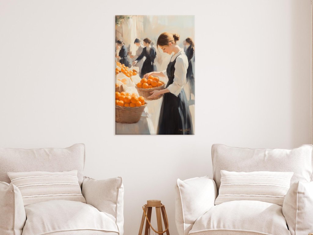 Obraz zobrazuje pokojnú scénu z trhoviska, kde mladá žena v jednoduchom odeve starostlivo vyberá pomaranče do prúteného košíka. Teplé svetlo dopadajúce zhora dodáva výjavu jemnosť a nostalgiu, zatiaľ čo kontrast medzi sýto oranžovým ovocím a tlmenými farbami šiat vytvára harmonickú rovnováhu. Celková atmosféra dýcha pokojom, starostlivosťou a každodennou krásou obyčajných chvíľ.