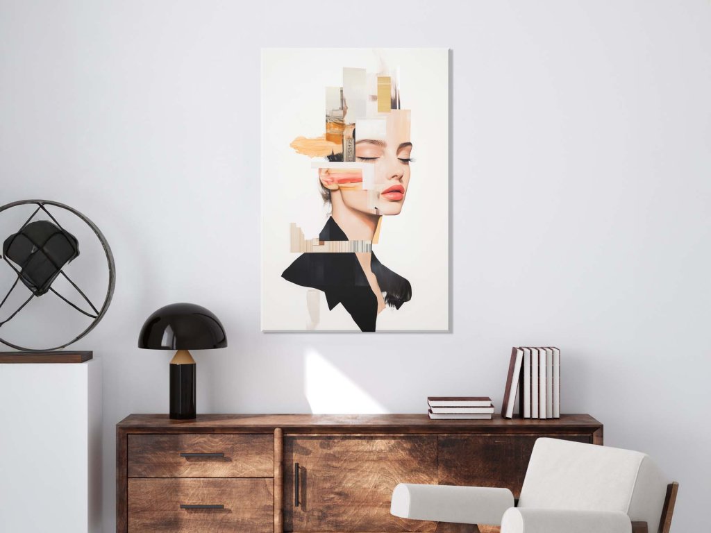 Obraz zobrazuje ženu so zatvorenými očami, pričom jej tvár a postava sú poskladané z rôznych vrstiev, textúr a výrezov v abstraktných farbách. Každý fragment pôsobí ako odraz inej spomienky alebo myšlienky, ktoré spolu vytvárajú komplexný celok. Celkové dielo evokuje introspektívnu náladu a vizuálne znázorňuje, ako sa minulosť, emócie a skúsenosti prepájajú v našom vedomí.