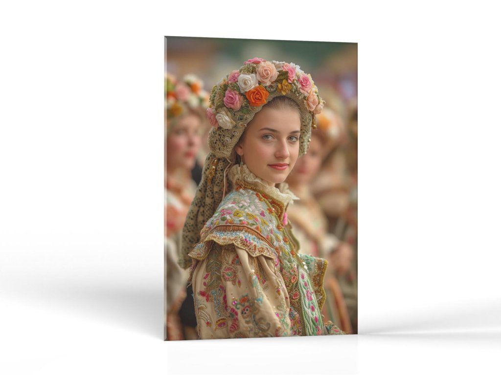 Mladá žena s pokojným výrazom tváre nosí bohato zdobený tradičný kroj a korunku plnú farebných kvetov. Jej odev vykazuje výnimočné detaily a remeselnú zručnosť, čo podčiarkuje jej prirodzenú krásu. V pozadí sú vidieť ďalšie osoby v podobných krojoch, čo naznačuje kultúrne alebo slávnostné zhromaždenie.