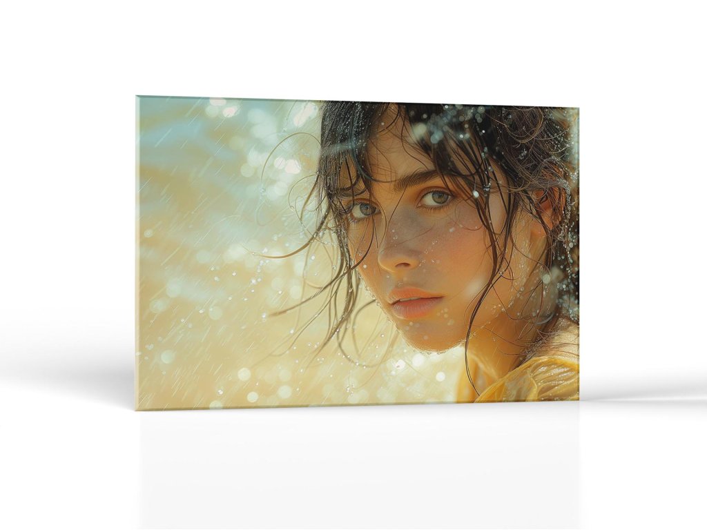 Obraz predstavuje ženu s intenzívnym pohľadom a vlhkými vlasmi, jej tvár zdobia drobné kvapky vody. Svetlo prenikajúce scénou vytvára jemnú a rozptýlenú atmosféru, zatiaľ čo bokeh efekt dodáva snový a umelecký nádych. Výraz ženy je zamyslený a pokojný, čo spolu s hrou svetla a tieňa na jej tvári evokuje výraz čistej a jednoduchej krásy.