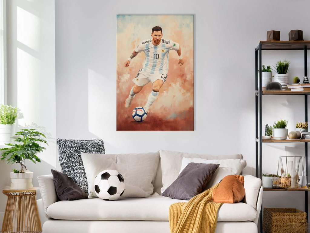 Tento obraz zachytáva futbalistu v argentínskom reprezentačnom drese číslo 10, ako rýchlo sústredene vedie loptu v pohybe. Jeho postoj a rozhodný pohľad zdôrazňujú dynamicky jeho technickú zručnosť a odhodlanie na ihrisku. Pozadie s jemnými farbami zvýrazňuje hráča a dáva pocit pohybu a energie, ktoré sú pre neho typické.