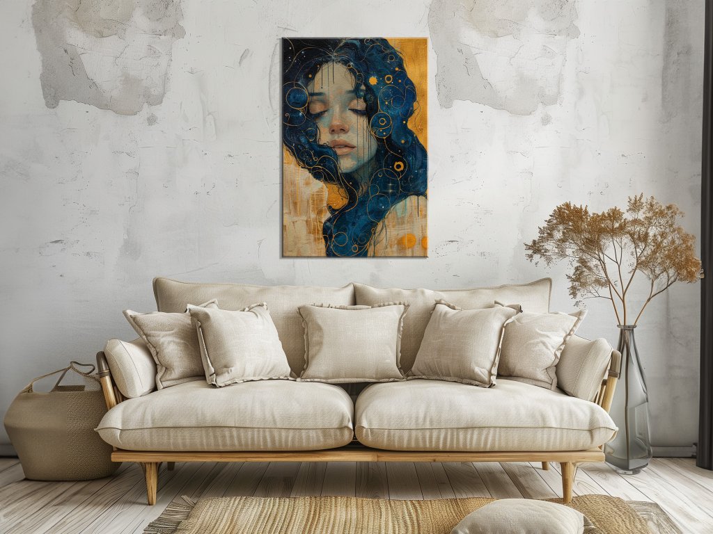 Tento obraz zobrazuje detailnú tvár ženy so zatvorenými očami, ktorá má vo vlasoch modré a zlaté ozdoby, pričom vlasy plynulo splývajú s pozadím. Zlaté akcenty na pozadí vytvárajú kontrast so sýtym modrým odtieňom vlasov a dodávajú obrazu mystickú a snovú atmosféru. Celková kompozícia evokuje pocit pokoja a nadpozemskosti, pričom spája krásu ľudského výrazu s nekonečnou krásou vesmíru.
