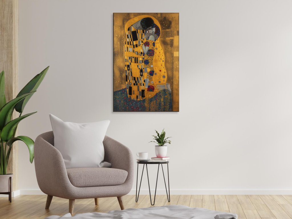 Obraz zobrazuje muža a ženu v intímnom objatí, pričom ich oblečenie a pozadie sú zdobené žltými a modrými geometrickými a kruhovými vzormi. Ich postavy sú stylizované s dôrazom na vzory a farby, čo pripomína techniku mozaiky. Obraz vyžaruje teplú atmosféru a je plný detailov, ktoré zdôrazňujú blízkosť a lásku medzi dvojicou.