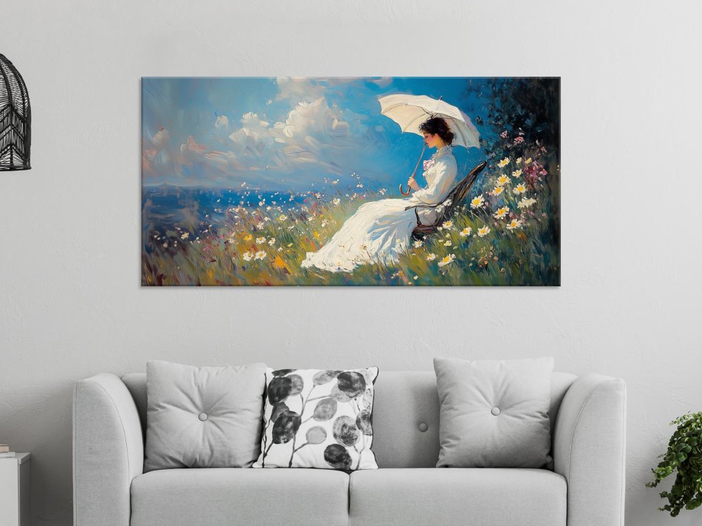 Obraz zachytáva pokojnú scénu ženy oddychujúcej na stoličke s bielym slnečníkom, obklopenú rozkvitnutou lúkou. Farby sú jemné, pričom modrá obloha s oblakmi a trblietajúce sa kvety vytvárajú snovú atmosféru. Dielo vyžaruje pokoj, ženskú nežnosť a nostalgický návrat k romantickým časom.