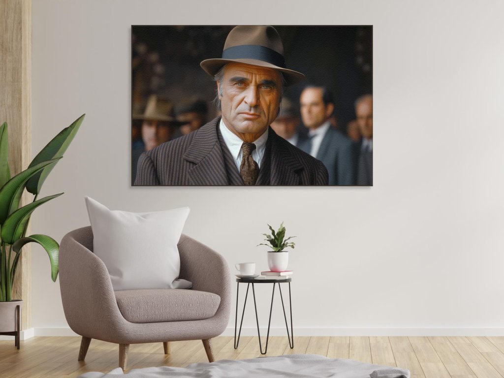 Muž so zaujímavými črtami tváre, v hnedom pruhovanom obleku a tmavom klobúku, má zaujatý výraz, ktorý odhaľuje vážnosť situácie. Jeho pohľad je fixovaný priamo na diváka, čo naznačuje možný dôležitý vývoj udalostí. Za mužom sa nachádza rozmazané pozadie s ďalšími ľuďmi, ktoré dáva najavo, že je súčasťou väčšej skupiny alebo davu.