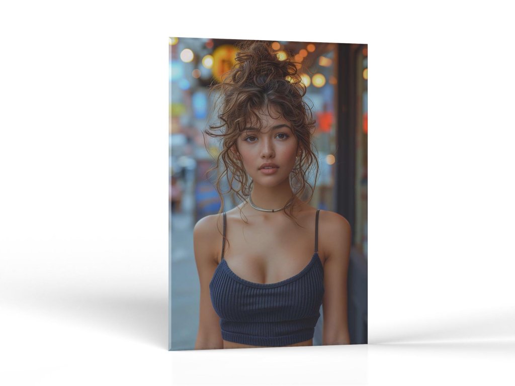 Na obrázku je mladá žena s postrapatenými kučerami, priamym pohľadom a pozadie rozjasňujú rozmazané mestské svetlá. Jej oči a výraz sú zamerané smerom von z obrazu, čo dodáva kompozícii zamyslený tón. Tmavomodré oblečenie kontrastuje s teplými tónmi na pozadí.