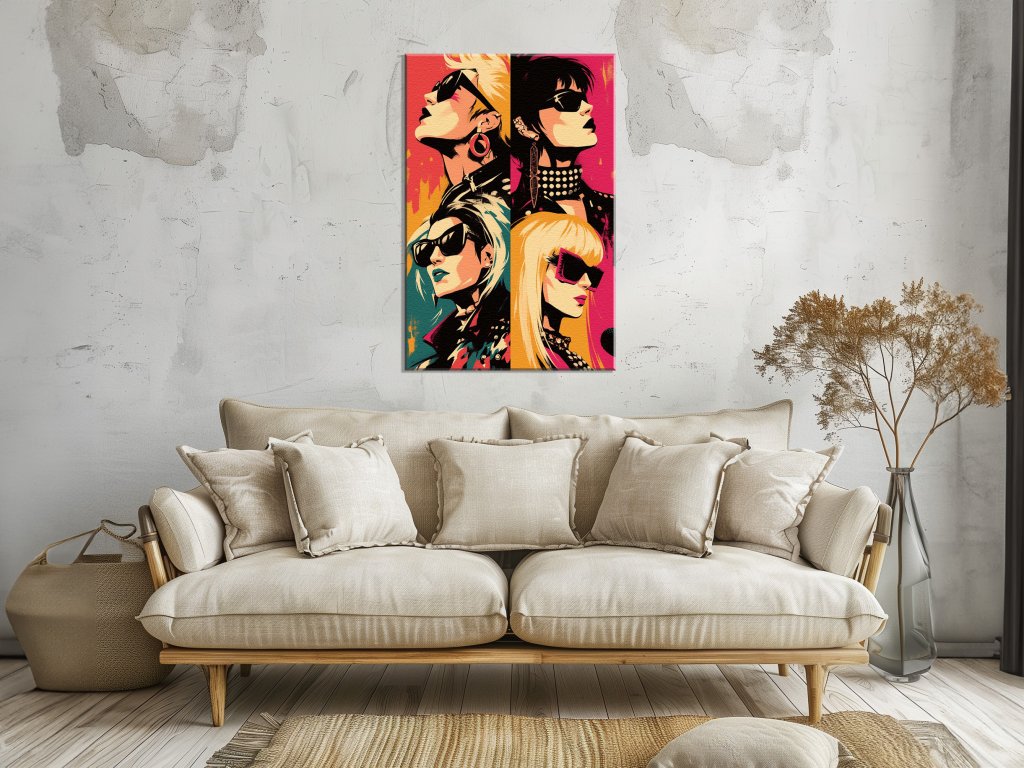 Tento obraz zobrazuje štyri punkové postavy, každú s výrazným účesom a charakteristickými doplnkami, ako sú okuliare, náušnice a náhrdelníky. Každá postava má svoj vlastný štýl, pričom všetky sú zasadené do farebného, kontrastného prostredia, ktoré odráža ich rebelantský a individuálny charakter. Tieto punkové ikony pôsobia sebavedomo a odvážne, vyjadrujúc svoju identitu prostredníctvom výrazného vzhľadu.