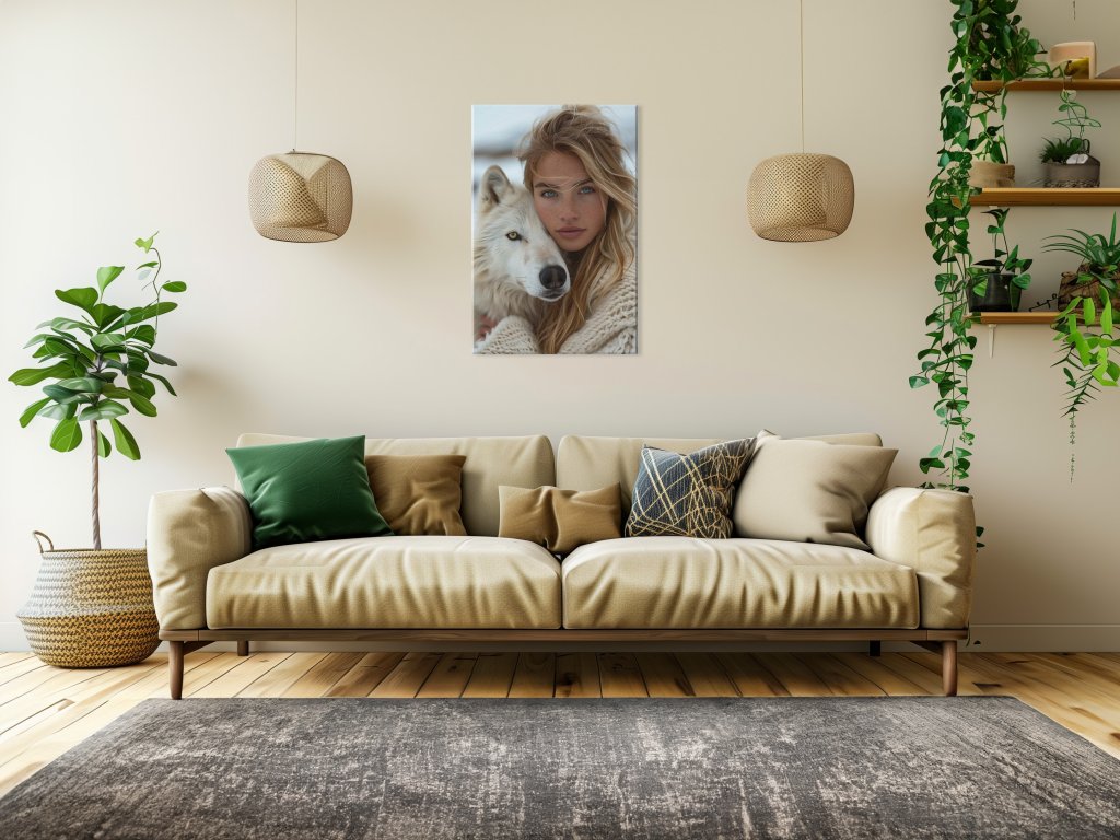 Na obraze je zobrazená mladá žena, ktorá je v tesnom kontakte s vlkom, ich tváre sa dotýkajú, čo vyjadruje hlboké spojenie medzi nimi. Obaja majú pokojný výraz, ktorý zosilňuje atmosféru harmónie a súdržnosti. Scéna sa odohráva v zasneženej zimnej krajine, kde biela farba snehu umocňuje čistotu a krásu tohto vzácneho okamihu.