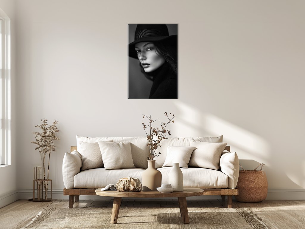 Tento čiernobiely portrét zobrazuje ženu s ostrými rysmi tváre a tajomným pohľadom, ktorá nosí elegantný klobúk. Jemné detaily na tvári a výrazné oči dodávajú obrazu pocit hlbokej introspekcie. Celková kompozícia evokuje eleganciu a tajomnosť, pričom klobúk a svetlo hrajú kľúčovú úlohu v zdôraznení charakteru modelky.
