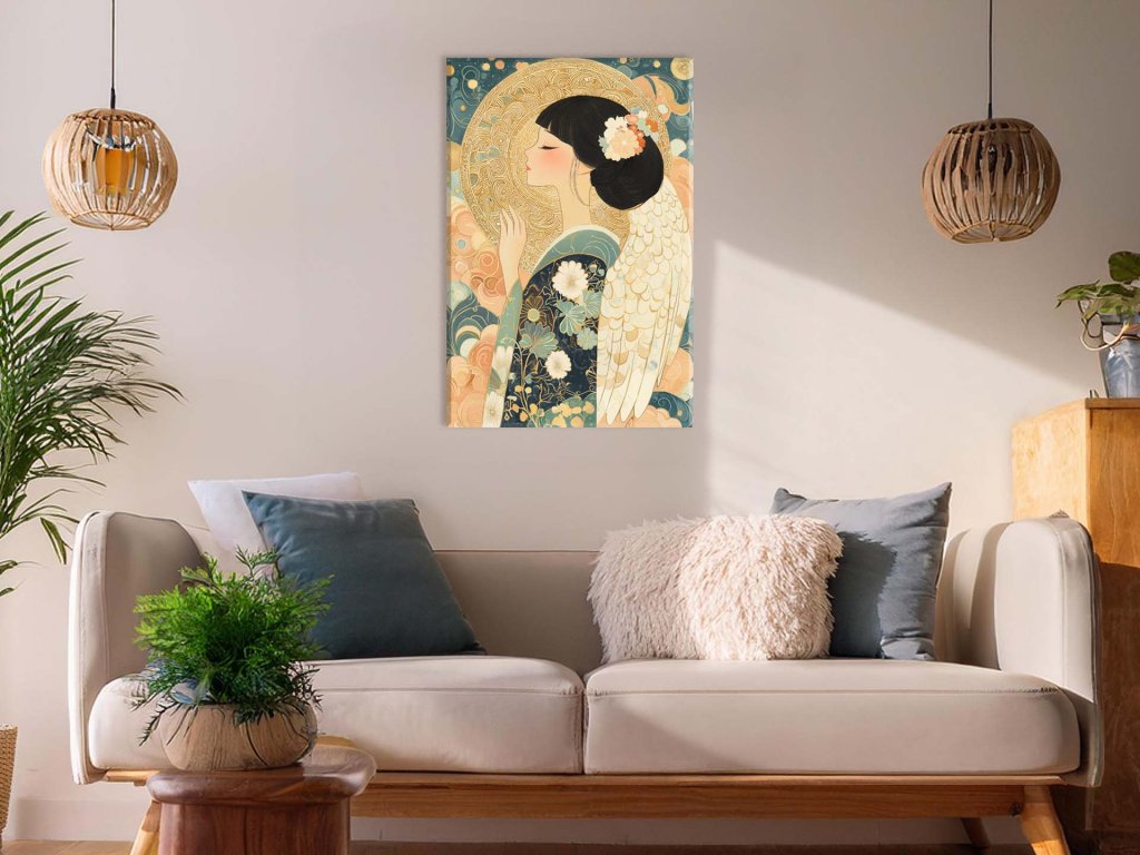 Tento obraz zobrazuje elegantnú ženu s tmavými vlasmi, zdobenými kvetmi, ktorá sa pokojne modlí alebo medituje. Oblečená je v tradičnom vzore s kvetinovými motívmi, zatiaľ čo za ňou sa rozprestiera zlatý kruh, symbolizujúci duchovnú auru. Krídla na jej chrbte evokujú obraz anjela, čo zdôrazňuje éterický a nadpozemský charakter scény.