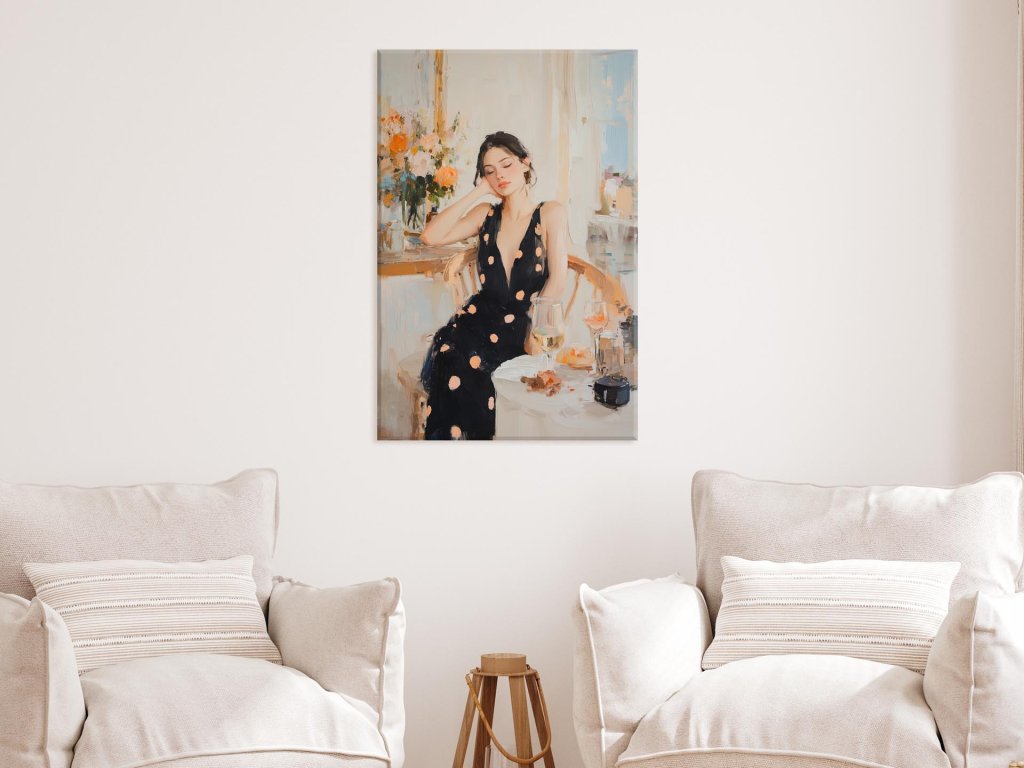 Obraz zachytáva intímnu chvíľu, v ktorej žena s jemne sklonenou hlavou a zatvorenými očami odpočíva v elegantnej miestnosti plnej svetla a kvetov. Je oblečená v čiernych šatách s ružovými bodkami, sediac pri stole so zvyškami jedla a pohármi vína, čo naznačuje chvíľu oddychu po večeri. Celá scéna pôsobí zasnene, žensky a poeticky – ako stíšené zamyslenie nad prežitým okamihom.