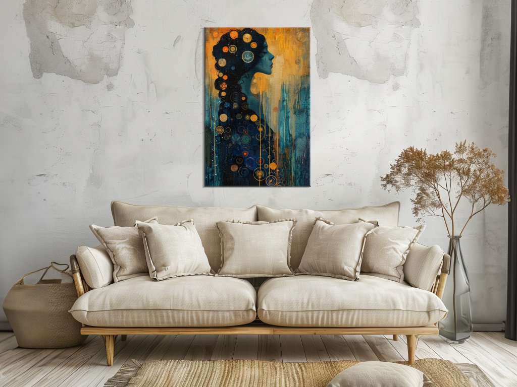 Tento obraz zobrazuje profil ženy s dlhými vlasmi, ktoré sú plné farebných prvkov Farby obrazu sú teplé odtiene oranžovej a modrej, čo vytvára mystickú a snovú atmosféru. Zlaté a modré kruhy v jej vlasoch symbolizujú nekonečno vesmíru a sny, ktoré v ňom ožívajú.