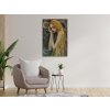 Obraz predstavuje mladú ženu s bohatými oranžovými vlasmi, ktorá má hlavu opretú o ruku v geste zamyslenia. Pozadie obrazu je vytvorené z množstva abstraktných kruhov a geometrických tvarov, ktoré pripomínajú mozaiku a pridávajú hĺbku celkovej kompozícii.