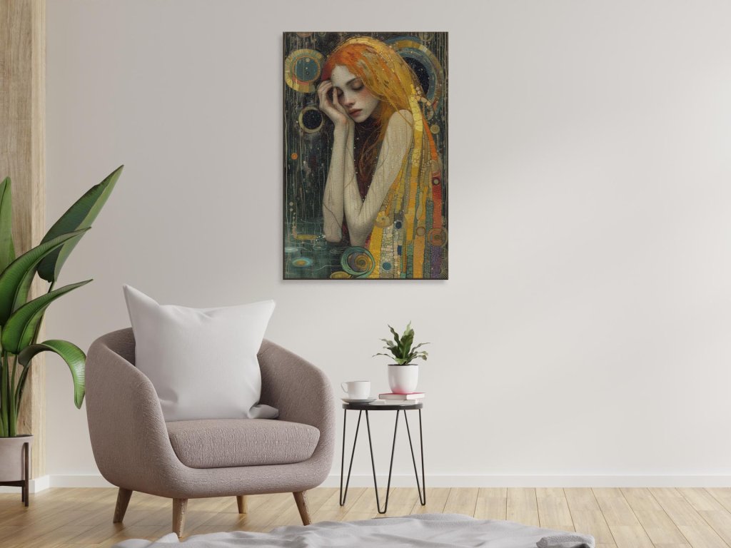 Obraz predstavuje mladú ženu s bohatými oranžovými vlasmi, ktorá má hlavu opretú o ruku v geste zamyslenia. Pozadie obrazu je vytvorené z množstva abstraktných kruhov a geometrických tvarov, ktoré pripomínajú mozaiku a pridávajú hĺbku celkovej kompozícii.