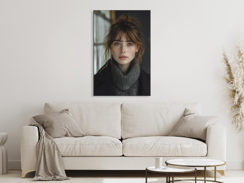 Na obraze je mladá žena s hnedými očami a s voľne padajúcimi hnedými vlasmi, zahľadená do diaľky. Jej tvár zdobia jemné pehy a ona je oblečená v tmavom kabáte a sivom svetri, čo naznačuje chladnejšie počasie. Svetlo prenikajúce cez okno za ňou vytvára jemnú aurou okolo jej postavy, čím zvýrazňuje jej prirodzenú krásu.