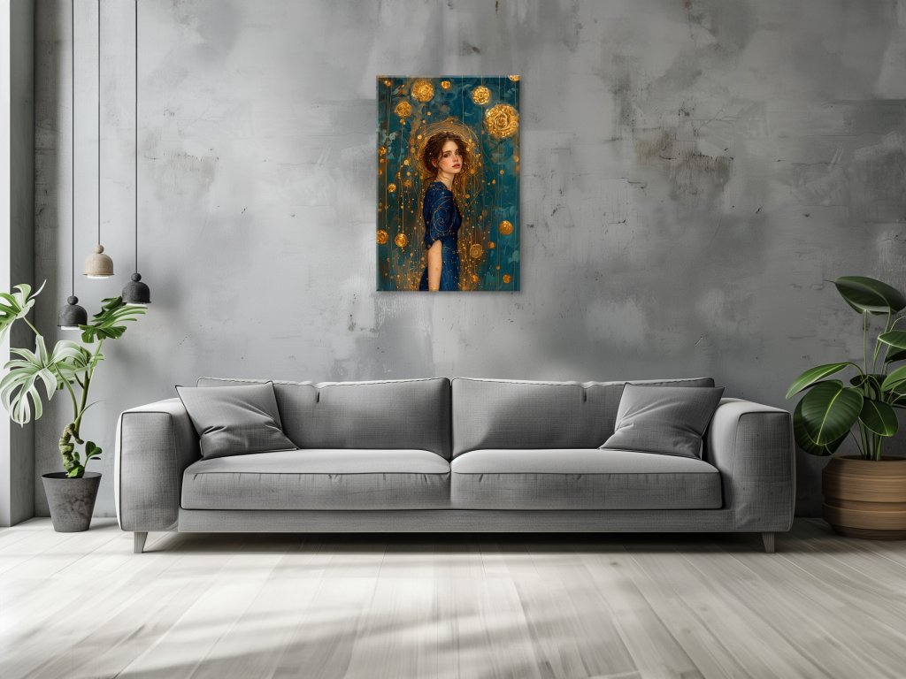 Na tomto obraze je zobrazená mladá žena v nádherných modrých šatách, s jemným a zamysleným výrazom tváre. Je obklopená bohatými zlatými ornamentmi, ktoré vytvárajú pocit mystiky a elegancie. Atmosféra obrazu je naplnená éterickou krásou a jemnosťou, pričom zlaté detaily dodávajú celkovému výzoru obraz božskej a nadprirodzenej bytosti.
