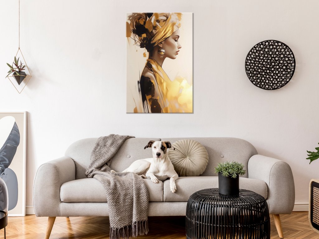 Tento obraz zachytáva profil ženy, ktorá vyžaruje eleganciu a sofistikovanosť. Zlaté detaily v jej šatke a náušniciach dodávajú obrazu nádych luxusu a jemnosti. Jemné línie a kontrasty čiernej a zlatej farby vytvárajú harmonický a vizuálne pútavý portrét.
