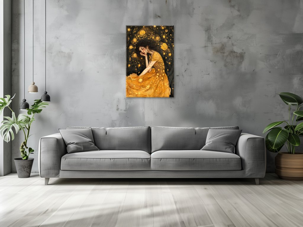 Mladá žena v nádherných zlatých šatách sníva s tvárou v dlani pod bohato hviezdnym nebom. Obraz vytvára atmosféru pokoja, no zároveň pôsobí dramaticky vďaka živej hviezdnej oblohe.