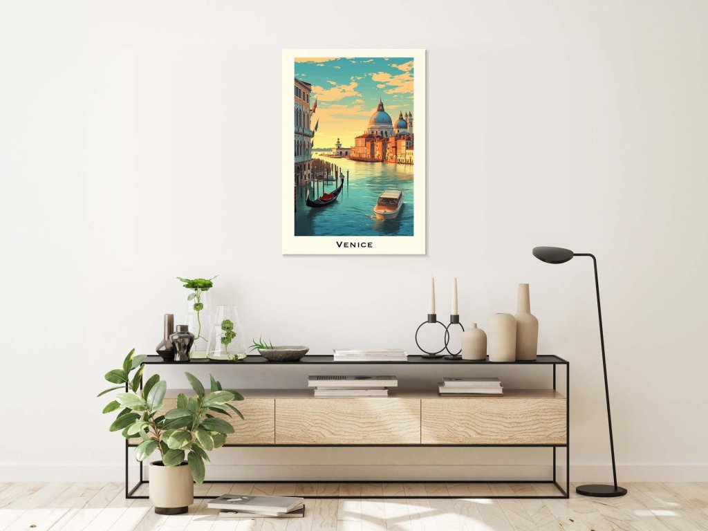 Na ilustrácii je vidno typický benátsky kanál obklopený historickými budovami v pozadí, s gondolou v popredí a motorovým člnom v pohybe. Pohľad je zdobený mäkkým svetlom pri západe slnka, ktoré sa odráža od zrkadlových vôd kanála, zatiaľ čo obloha je posiatá riedkymi oblakmi, dodávajúc scenérii pokojnú atmosféru. Architektúra a plavidlá spolu vytvárajú idylický obraz benátskeho života a kultúry.