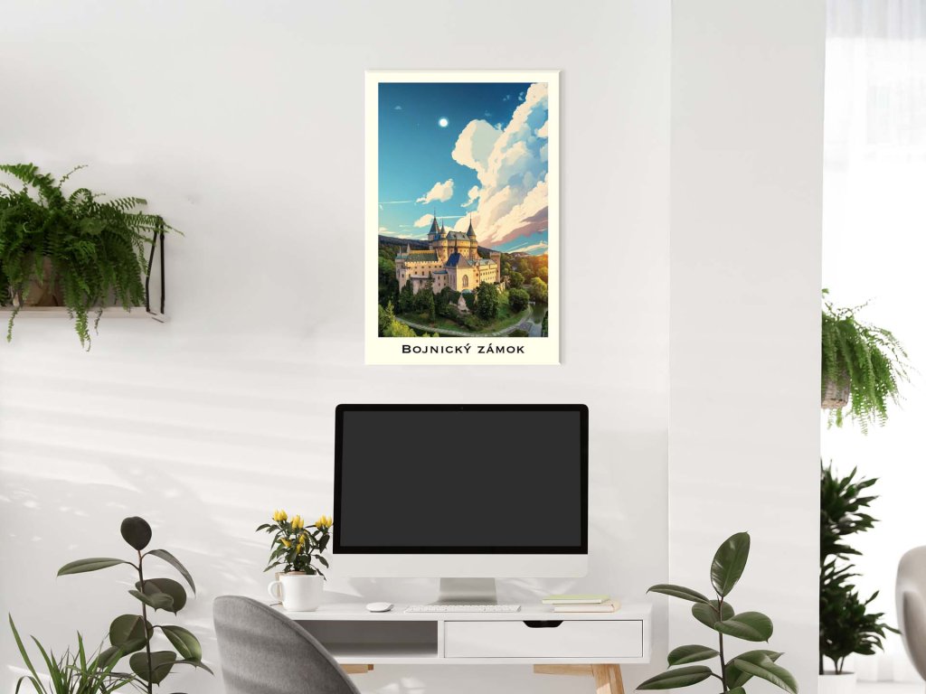 Tento obraz zobrazuje nádherný Bojnický zámok, obklopený zeleňou a malebnou krajinou, ako stojí pod modrou oblohou s dramatickými oblakmi. Svojou architektúrou a vežami pripomína rozprávkové hrady, čo ho robí jedným z najkrajších zámkov na Slovensku. Je to významný turistický cieľ a symbol slovenskej kultúry a histórie, lákajúci návštevníkov z celého sveta.