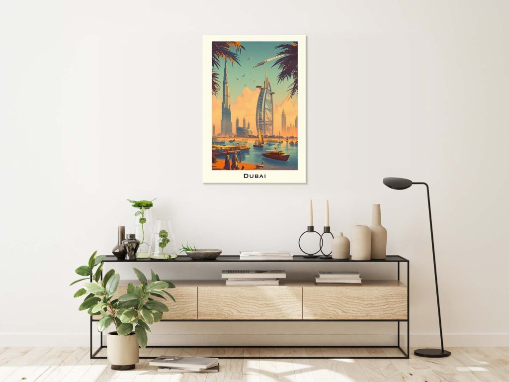 Tento obraz zachytáva modernú panorámu Dubaja s ikonickým Burj Khalifa a Burj Al Arab v pozadí. Scéna zobrazuje živý prístav s loďami a plachetnicami, zatiaľ čo dve postavy v tradičnom oblečení prechádzajú v popredí. Atmosféru dopĺňa jasná obloha a palmy, ktoré rámujú scénu.