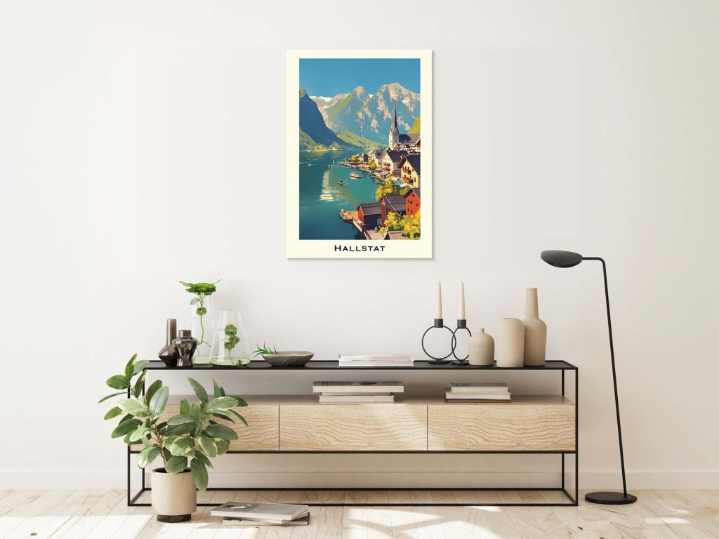 Obraz zachytáva malebné rakúske mestečko Hallstatt s jeho charakteristickým bielym kostolíkom a tradičnými domami odzrkadľujúcimi sa v krištáľovo čistých vodách jazera. V pozadí sa týčia impozantné horské vrcholy Álp, ktoré dotvárajú scenériu pokojného, ale zároveň majestátneho prírodného raja. Mestečko je známe svojou nádhernou lokalitou a historickým dedičstvom, ktoré prilákalo nespočetné množstvo návštevníkov z celého sveta.