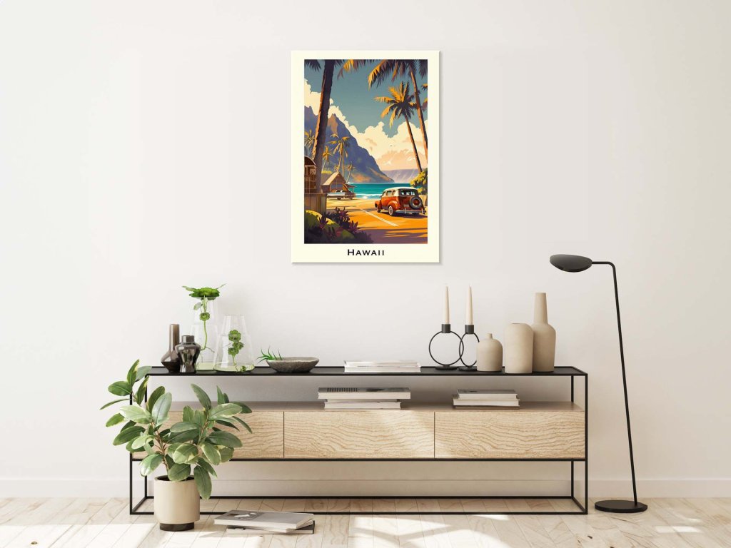 Tento obraz zachytáva idylickú scenériu s palmami a starodávnym červeným autom zaparkovaným pri ceste, ktorá vedie k azúrovo modrému moru a pláži. V pozadí sa týčia vysoké horské útvary, ktoré dotvárajú panorámu typickú pre havajskú krajinu. Nebo je plné bielych oblakov a vyvoláva pocit pokojného a relaxačného dňa.
