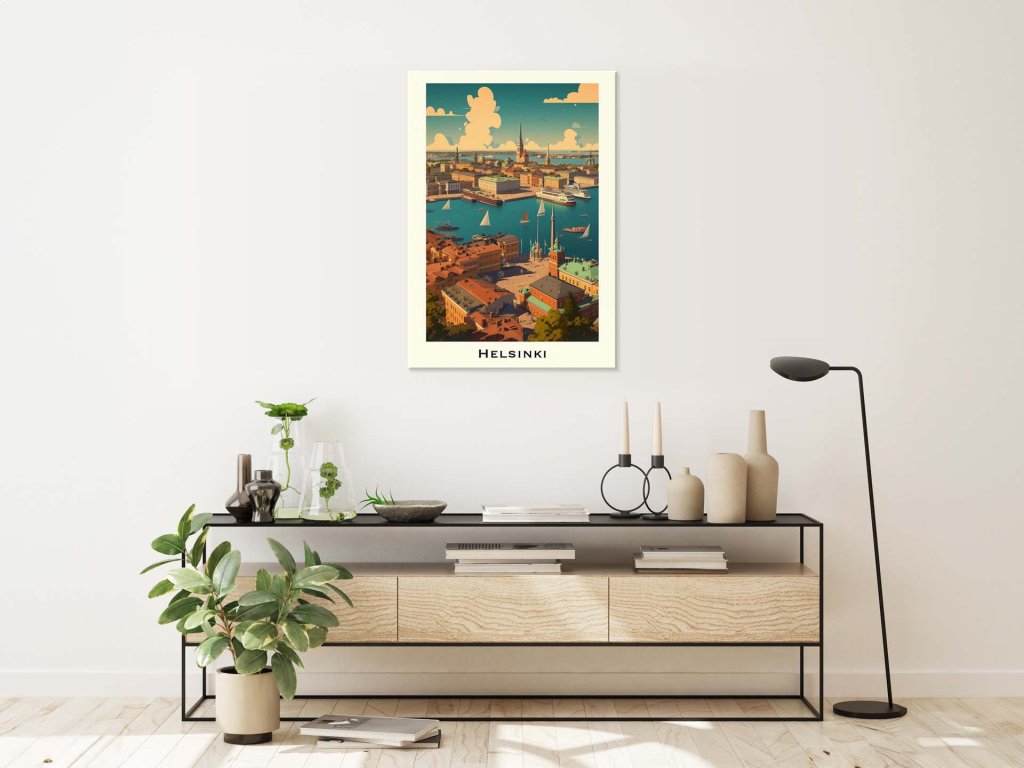 Ilustrácia predstavuje panoramatický pohľad na mesto Helsinki s výhľadom na prístav.