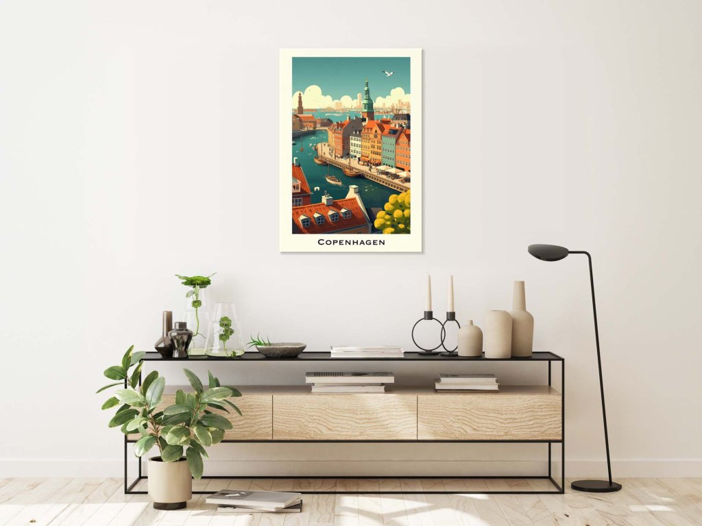 Na obrázku je vyobrazený kanál v Kodani lemovaný typickými pestrofarebnými domami a usporiadanými lodičkami. V pozadí sa vypínajú charakteristické výškové budovy a mestská architektúra, zatiaľ čo nad mestom lietajú čajky, čím dotvárajú idylickú scénu dánskeho hlavného mesta. Atmosféru dopĺňa živý ruch na promenáde popri kanáli.