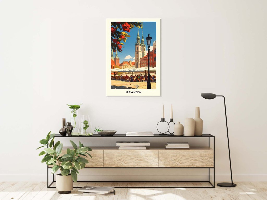 Na obraze je zobrazené rušné krakovské námestie, so zvýraznenými vežami kostola sv. Márie. Námestie oživujú ľudia sediaci pri vonkajších stoloch kaviarní a prechádzajúci okolo, zatiaľ čo bohato kvitnúce rastliny a historické lampy dotvárajú scénu. Čistá modrá obloha a jemné oblaky nadčrtávajú ideálny letný deň v tomto historickom meste.