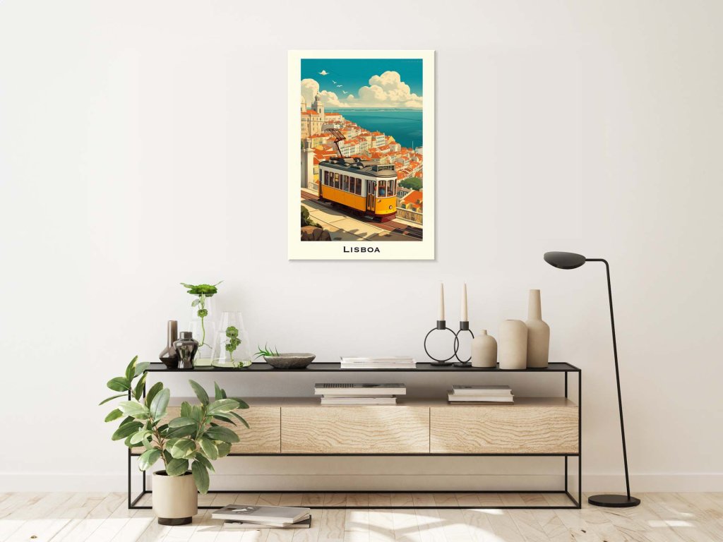 Na obraze je vyobrazená žltá električka vo svahu ulice, s nádherným výhľadom na klastrové usporiadanie červených strešných domov Lisabonu a široký výhľad na rieku Tejo. V pozadí je vidno klasicistickú architektúru a jasnú modrú oblohu s mäkkými, bielymi oblakmi, ktoré umocňujú idylickú atmosféru portugalského hlavného mesta.