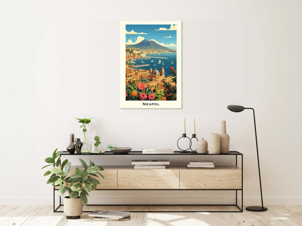 Tento obrázok zachytáva malebný pohľad na mesto Neapol s dominantnou siluetou Vezuvu v pozadí. Na prednej strane sú vidieť charakteristické terakotové strechy a kupoly kostolov, ktoré sú obklopené bujnou zelenou vegetáciou a farebnými kvetmi. Prístav je živý s jachtami a člnmi, ktoré zdôrazňujú pobrežný charakter mesta.
