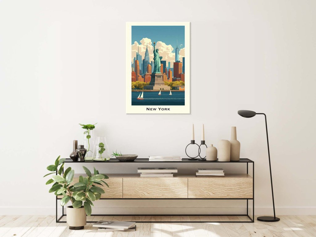 Tento obraz zachytáva ikonickú panorámu mesta New York, s dominantnou Sochou slobody v popredí a výškovými budovami v pozadí, medzi ktorými vyniká Empire State Building a One World Trade Center. Obloha je jasná s oblakmi, čo pridáva dramatičnosť scény. V popredí možno vidieť pohybujúce sa plachetnice, ktoré dotvárajú idylickú atmosféru mestskej promenády.